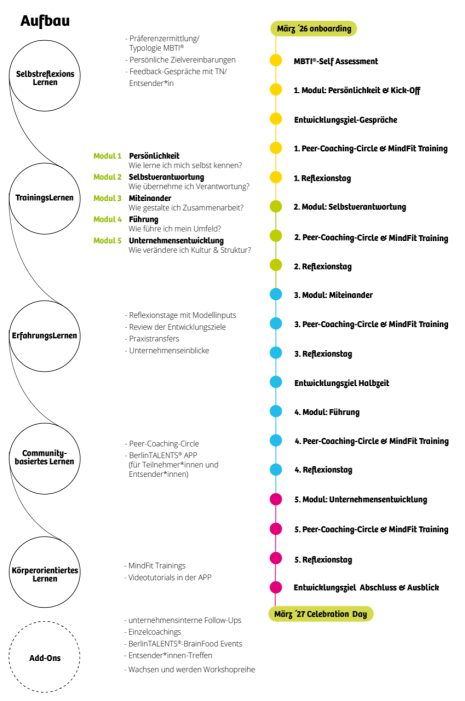 BerlinTALENTS® ist eine firmenübergreifende Qualifizierung mit maximal 16 Teilnehmer*innen in der ganzheitlich in 4 Phasen und auf 5 Lernebenen gearbeitet wird. So entsteht ein vertrauensvoller Kontakt und die erlernten Kompetenzen können direkt – im Austausch mit den anderen Teilnehmer*innen – aus verschiedenen Denkrichtungen und Blickwinkeln reflektiert werden. Dies erleichtert den Praxistransfer in den Arbeitsalltag.